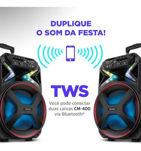 A Caixa Amplificada Connect Light CM-400 vai turbinar a sua festa! Os 400W RMS de potência e alto falante 12 polegadas vão garantir um som potente, com alta qualidade e performance. É possível duplicar o som com a função TWS (True Wireless Stereo): conecte duas caixas amplificadas CM-400, sem o uso de fios. Incrível, né? A caixa ainda tem transmissão via Bluetooth e bateria recarregável e bivolt. Saiba mais sobre a Caixa Amplificada CM-400 da Mondial: