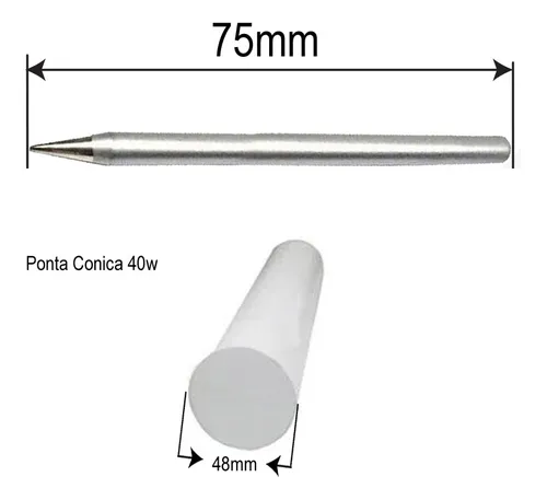 O kit inclui 4 pontas cônicas de 4.8x75mm, ideais para uma ampla gama de aplicações de soldagem. Com potência de 40W, este ferro de solda aquece rapidamente e mantém uma temperatura constante, permitindo um trabalho contínuo e sem interrupções.