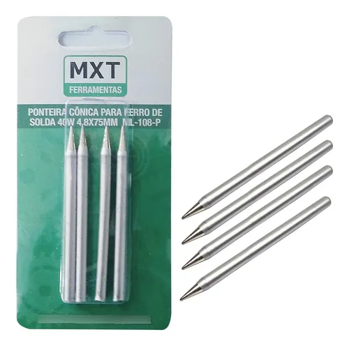 Apresentamos o Kit 4 Ponta Cônica Ferro Solda 40w 4.8x75mm MXT ML-108-P, uma ferramenta essencial para todos os profissionais e entusiastas de eletrônica. Com a qualidade e confiabilidade da marca MXT, este kit é perfeito para realizar trabalhos de soldagem com precisão e eficiência.