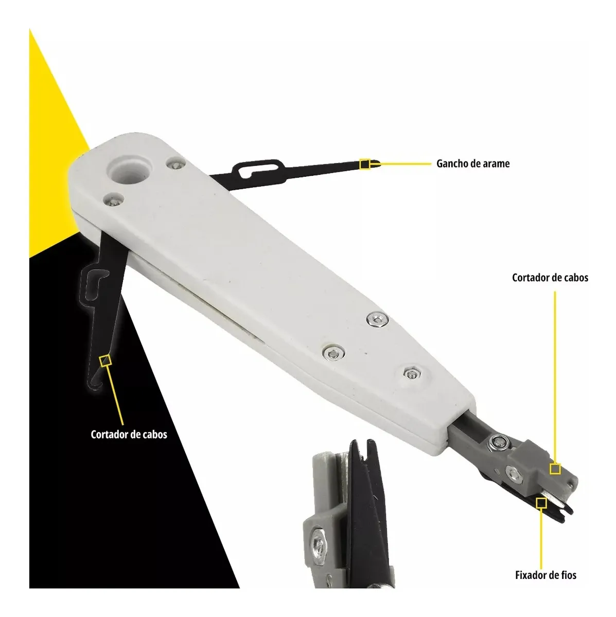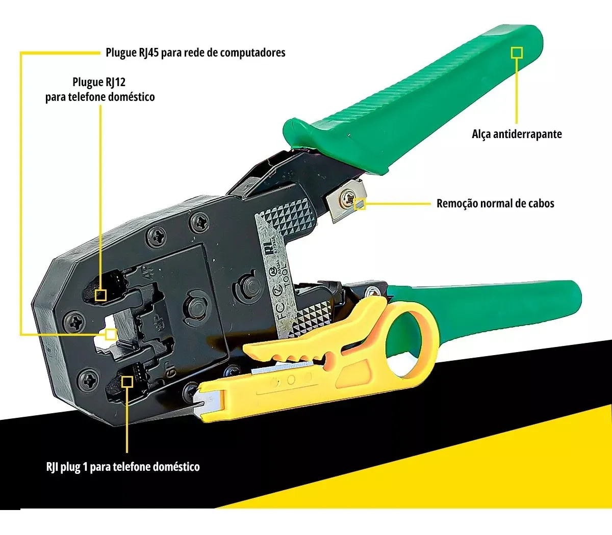 Para desencapar, cortar e crimpar fios de rede lógica e rede de telefonia. compativel com Cat5, Cat5-e, Cat-6. Utilizar terminais RJ45(8 Pinos) e RJ11/12 (4 e 6 Pinos)
