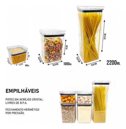 Este conjunto com 12 potes quadrados herméticos é ideal para conservar os alimentos e deixar sua cozinha mais bonita e organizada.