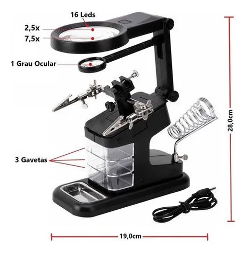 A Lupa com Suporte é um equipamento multiuso que é extremamente útil para reparos em equipamentos eletrônicos como C.I (Circuitos Impressos), chips, placas, soldagem de fios, e também serve como ferramenta de apoio para trabalhos com pequenos objetos que exigem uma melhor visualização e precisão, como micro soldagens, artesanato, entre outros.