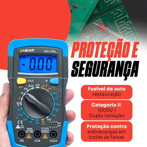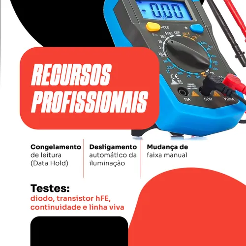 Instrumento digital portátil com fusível de auto restauração, teste de linha viva, haste protetor, LCD de 3 ½ dígitos com iluminação de fundo, categoria II de segurança, congelamento de leitura, desligamento automático e mudança de faixa manual. Mede tensão DC e AC, corrente DC e AC, resistência, hFE de transistor, diodo e continuidade.