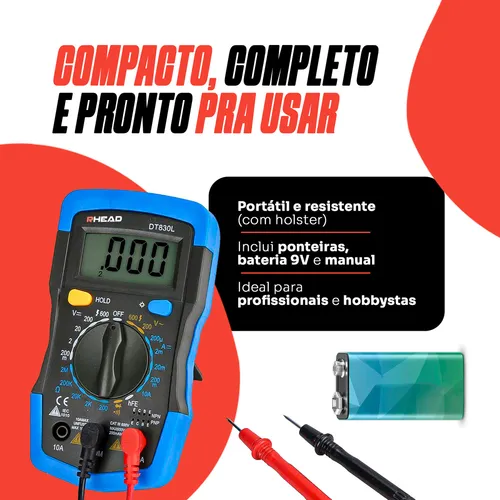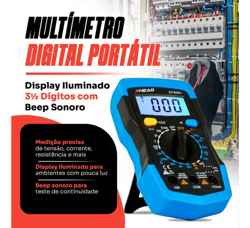 1 x Multímetro Digital Rhead Portátil Display 3 1/2 Iluminado com Sonoro;
