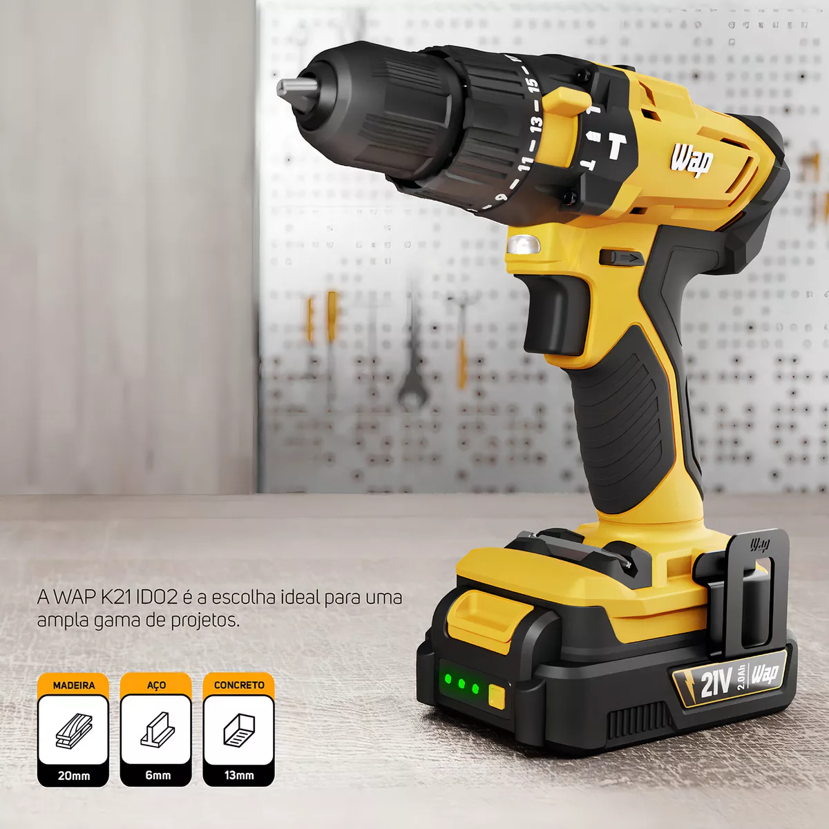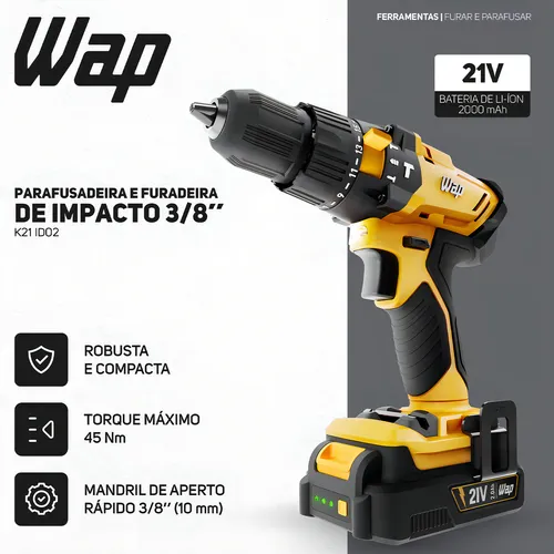 Ideal para uso em madeira (até 20mm), aço (até 6mm) e concreto (até 13mm), a WAP K21 ID02 combina eficiência e controle, sendo uma escolha excelente tanto para projetos residenciais quanto profissionais, mantendo a qualidade e desempenho característicos da marca WAP.