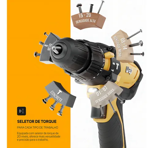A Parafusadeira e Furadeira de Impacto WAP K21 ID02 é uma ferramenta versátil e robusta, projetada para enfrentar projetos de diferentes tamanhos. Com torque máximo de 45 Nm e mandril de aperto rápido de 3/8″ (10mm), oferece 21 níveis de torque, permitindo ajuste preciso para cada tarefa. Seu seletor de função permite alternar entre parafusar, perfurar e perfurar com impacto, enquanto o seletor de dois níveis de velocidade adapta a rotação conforme necessário.