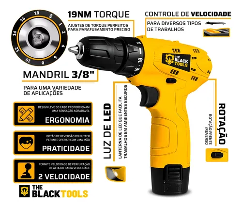 PARAFUSADEIRA FURADEIRA 3/8 10MM SEM FIO BATERIA 12V BIVOLT TB-12A – The Black Tools