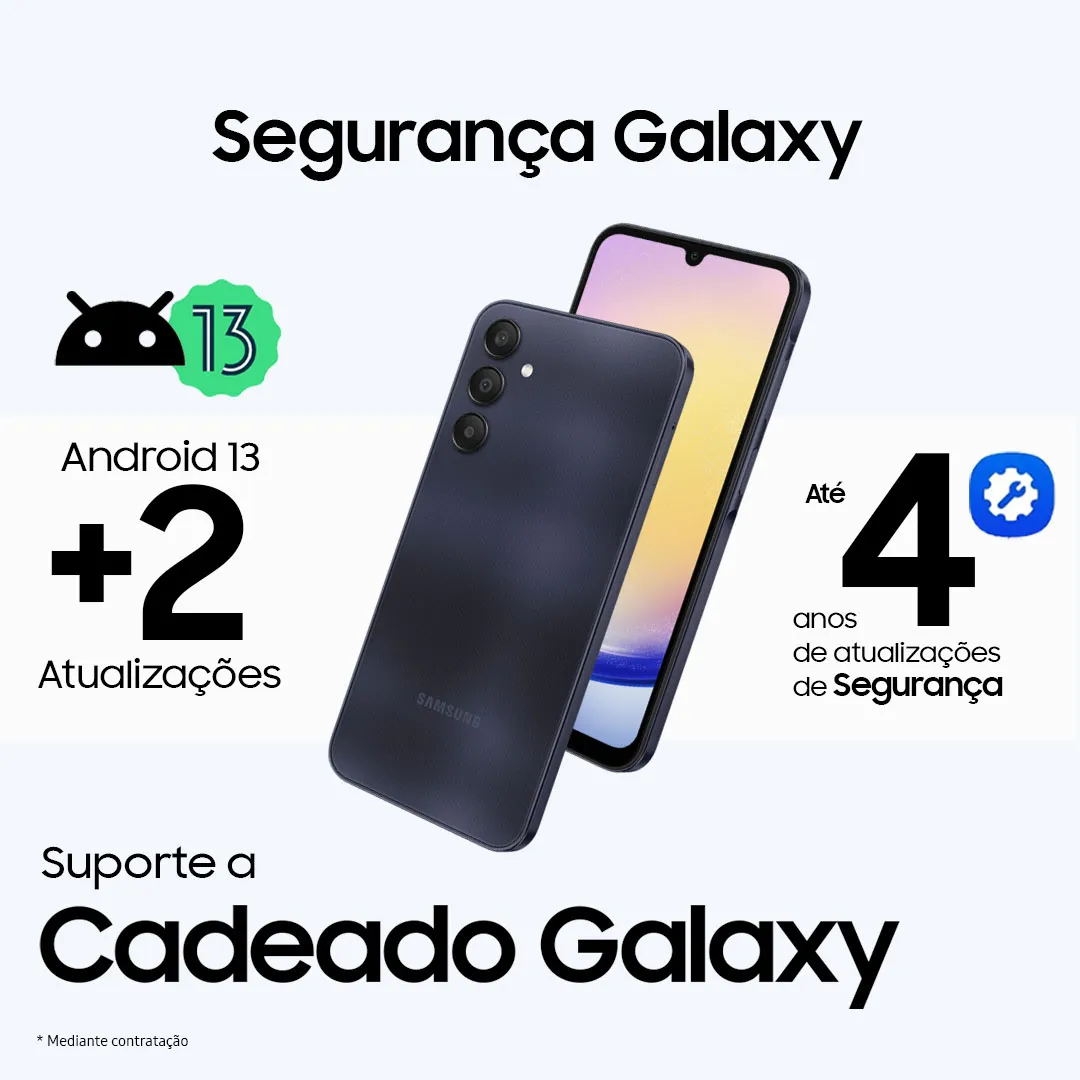 Para uma experiência duradoura e segura com o seu aparelho, o Galaxy A05s assegura até 2 atualizações de sistema operacional Android e até 4 anos de atualizações de Segurança. Fora isso, a sua proteção é aprimorada com Samsung Knox, garantindo que dados confidenciais e sigilosos permaneçam seguros, e com Cadeado Galaxy, protegendo os seus dados e acessos a aplicativos por terceiros.