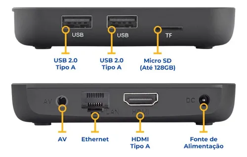 Conexões : 1x Saída AV | 1x HDMI tipo A | 1x Entrada Micro SD (Suporta até 128Gb) | 2x entradas USB 2.0 Tipo A